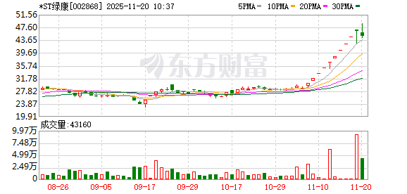*ST绿康再度涨停,11个交易日内录得10个涨停,累计涨幅为69.11%,累计换手率为14.74%。截至9:38,该股今日成交量98.07万股,成交金额4685.10万元,换手率0.64%。最新A股总市值达75.72亿元,A股流通市值75.05亿元。